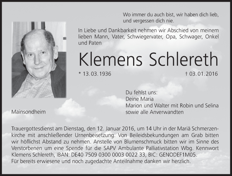 Hier finden Sie alle Traueranzeigen aus der Zeitung, die bisher für Klemens Schlereth erschienen sind. Weitere Traueranzeigen, die in der Zeitung erscheinen, werden hier ebenfalls aufgelistet