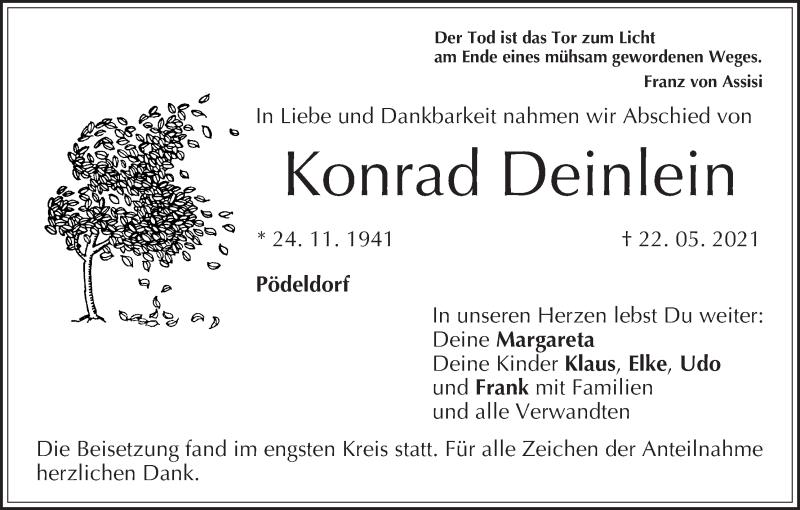 Hier finden Sie alle Traueranzeigen aus der Zeitung, die bisher für Konrad Deinlein erschienen sind. Weitere Traueranzeigen, die in der Zeitung erscheinen, werden hier ebenfalls aufgelistet