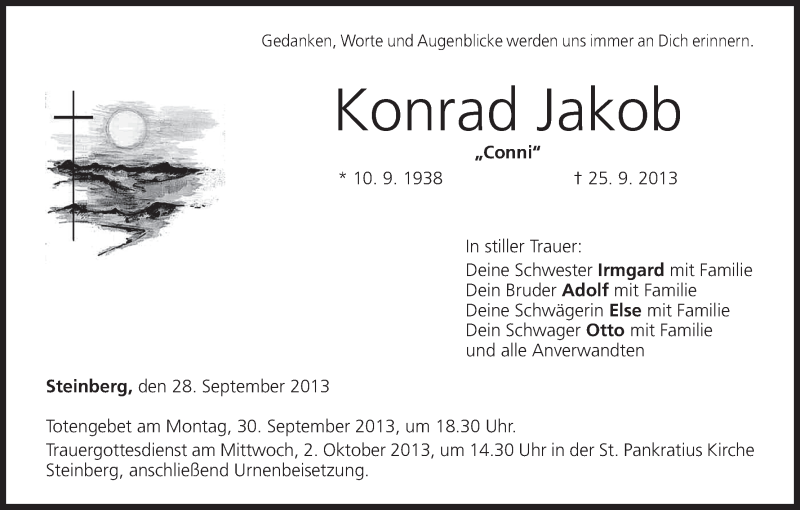 Hier finden Sie alle Traueranzeigen aus der Zeitung, die bisher für Konrad Jakob erschienen sind. Weitere Traueranzeigen, die in der Zeitung erscheinen, werden hier ebenfalls aufgelistet