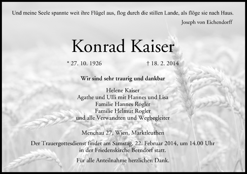 Hier finden Sie alle Traueranzeigen aus der Zeitung, die bisher für Konrad Kaiser erschienen sind. Weitere Traueranzeigen, die in der Zeitung erscheinen, werden hier ebenfalls aufgelistet