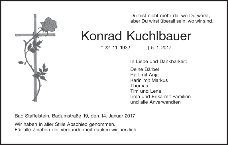 Hier finden Sie alle Traueranzeigen aus der Zeitung, die bisher für Konrad Kuchlbauer erschienen sind. Weitere Traueranzeigen, die in der Zeitung erscheinen, werden hier ebenfalls aufgelistet