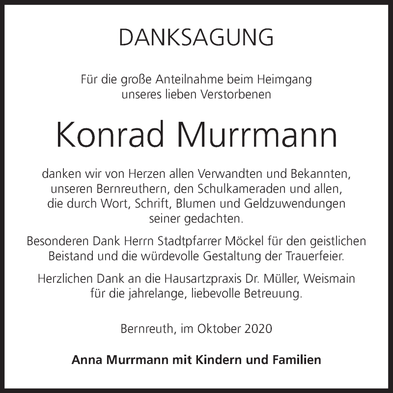 Hier finden Sie alle Traueranzeigen aus der Zeitung, die bisher für Konrad Murrmann erschienen sind. Weitere Traueranzeigen, die in der Zeitung erscheinen, werden hier ebenfalls aufgelistet