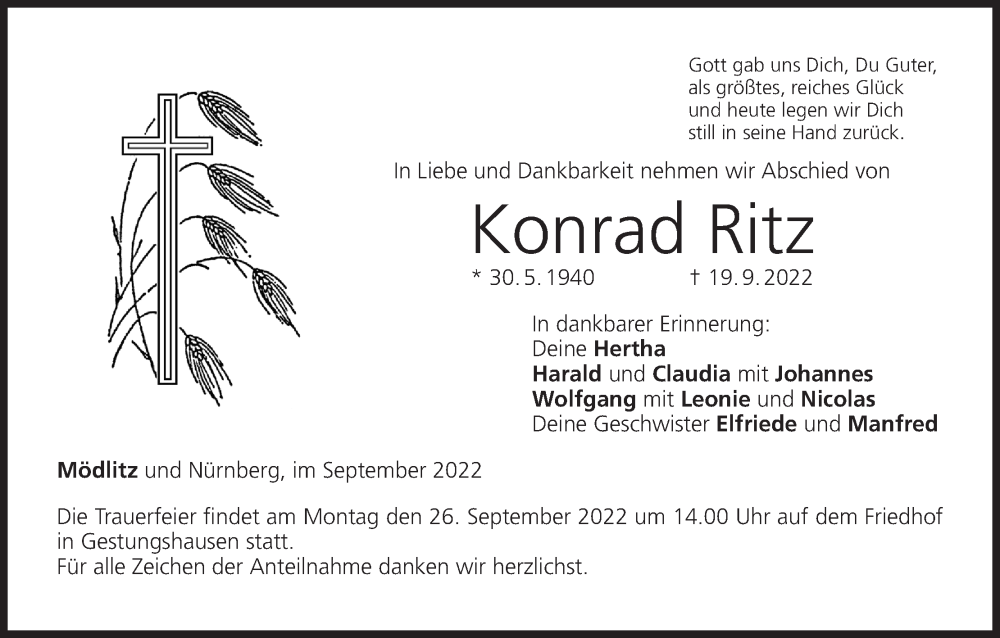 Hier finden Sie alle Traueranzeigen aus der Zeitung, die bisher für Konrad Ritz erschienen sind. Weitere Traueranzeigen, die in der Zeitung erscheinen, werden hier ebenfalls aufgelistet