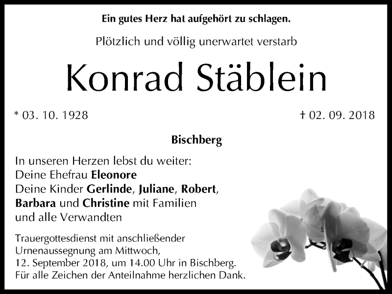 Hier finden Sie alle Traueranzeigen aus der Zeitung, die bisher für Konrad Stäblein erschienen sind. Weitere Traueranzeigen, die in der Zeitung erscheinen, werden hier ebenfalls aufgelistet