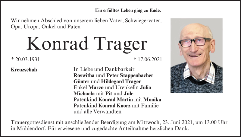 Hier finden Sie alle Traueranzeigen aus der Zeitung, die bisher für Konrad Trager erschienen sind. Weitere Traueranzeigen, die in der Zeitung erscheinen, werden hier ebenfalls aufgelistet