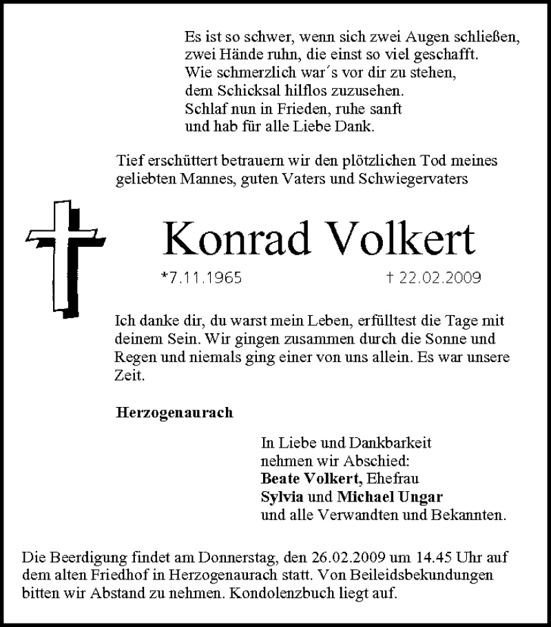 Hier finden Sie alle Traueranzeigen aus der Zeitung, die bisher für Konrad Volkert erschienen sind. Weitere Traueranzeigen, die in der Zeitung erscheinen, werden hier ebenfalls aufgelistet