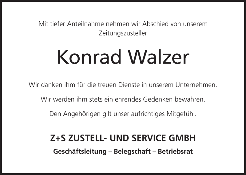 Hier finden Sie alle Traueranzeigen aus der Zeitung, die bisher für Konrad Walzer erschienen sind. Weitere Traueranzeigen, die in der Zeitung erscheinen, werden hier ebenfalls aufgelistet
