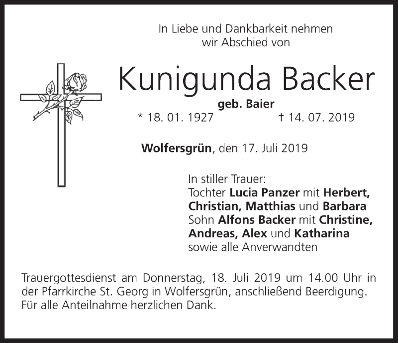 Hier finden Sie alle Traueranzeigen aus der Zeitung, die bisher für Kunigunda Backer erschienen sind. Weitere Traueranzeigen, die in der Zeitung erscheinen, werden hier ebenfalls aufgelistet