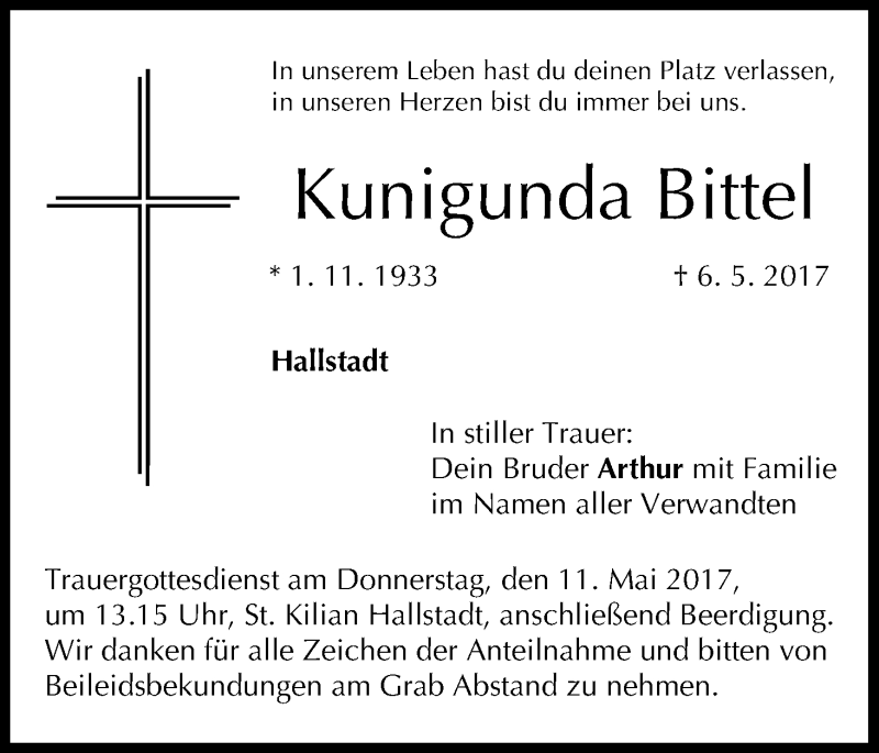 Hier finden Sie alle Traueranzeigen aus der Zeitung, die bisher für Kunigunda Bittel erschienen sind. Weitere Traueranzeigen, die in der Zeitung erscheinen, werden hier ebenfalls aufgelistet