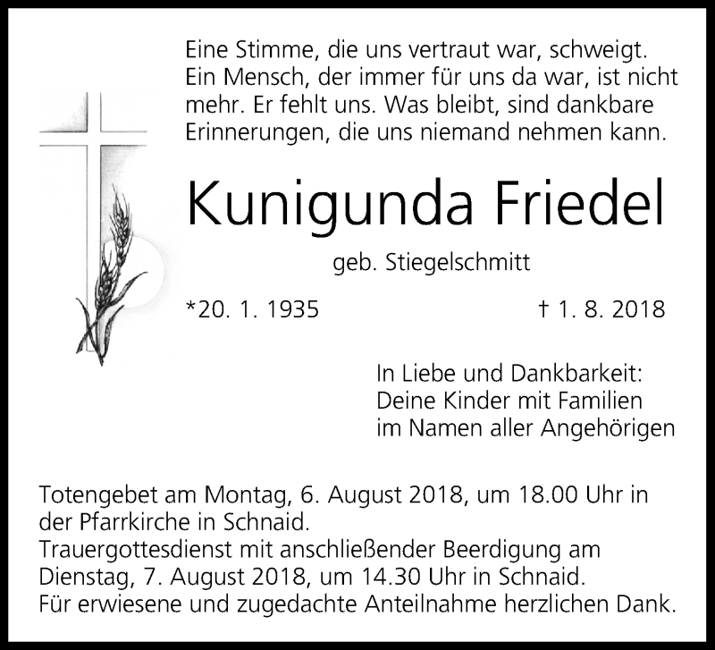 Hier finden Sie alle Traueranzeigen aus der Zeitung, die bisher für Kunigunda Friedel erschienen sind. Weitere Traueranzeigen, die in der Zeitung erscheinen, werden hier ebenfalls aufgelistet