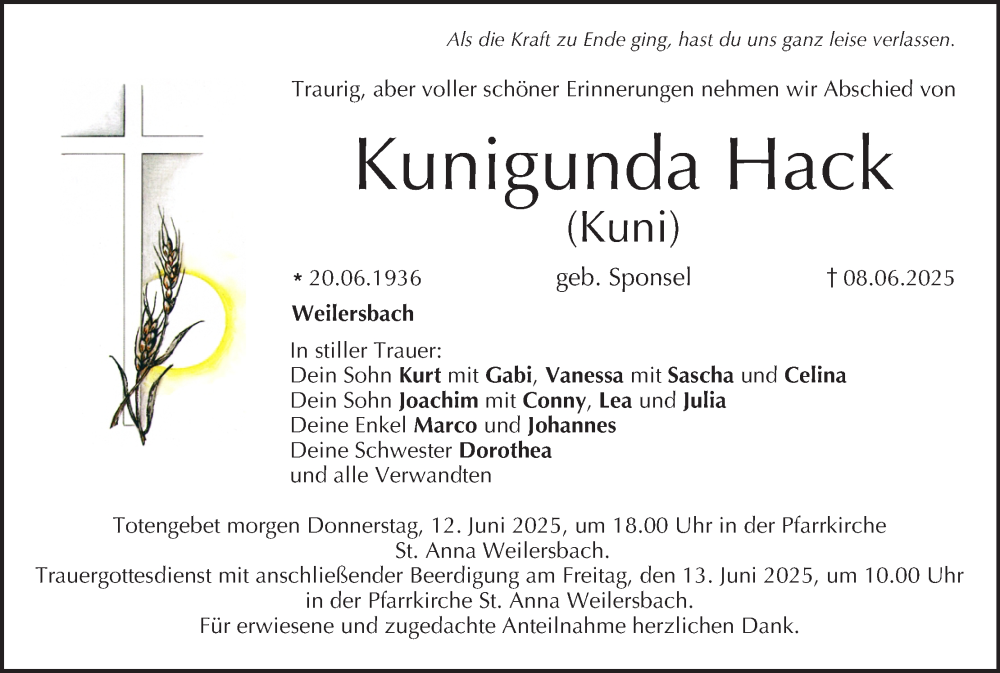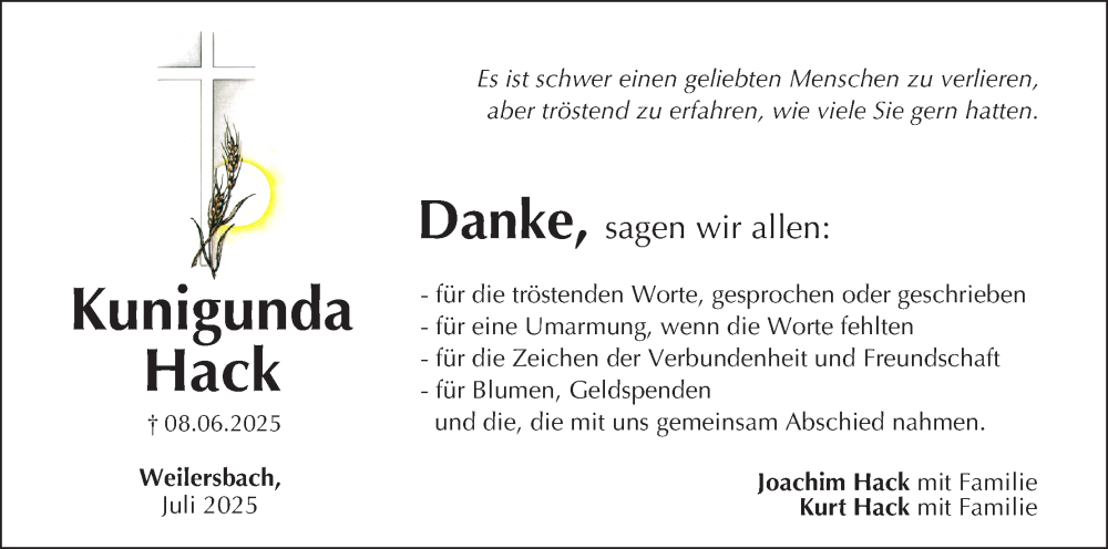 Hier finden Sie alle Traueranzeigen aus der Zeitung, die bisher für Kunigunda Hack erschienen sind. Weitere Traueranzeigen, die in der Zeitung erscheinen, werden hier ebenfalls aufgelistet