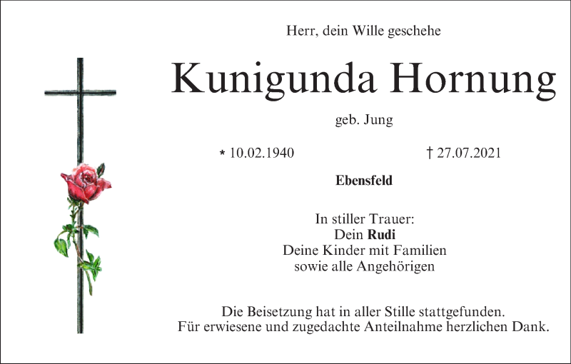 Hier finden Sie alle Traueranzeigen aus der Zeitung, die bisher für Kunigunda Hornung erschienen sind. Weitere Traueranzeigen, die in der Zeitung erscheinen, werden hier ebenfalls aufgelistet