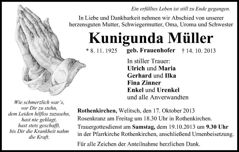 Hier finden Sie alle Traueranzeigen aus der Zeitung, die bisher für Kunigunda Müller erschienen sind. Weitere Traueranzeigen, die in der Zeitung erscheinen, werden hier ebenfalls aufgelistet