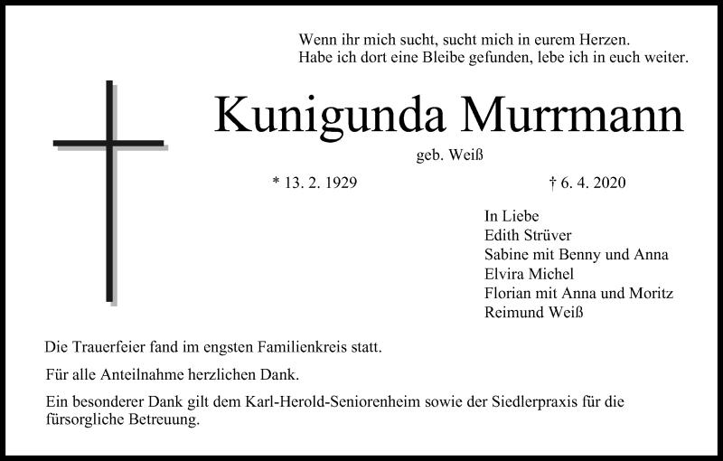 Hier finden Sie alle Traueranzeigen aus der Zeitung, die bisher für Kunigunda Murrmann erschienen sind. Weitere Traueranzeigen, die in der Zeitung erscheinen, werden hier ebenfalls aufgelistet
