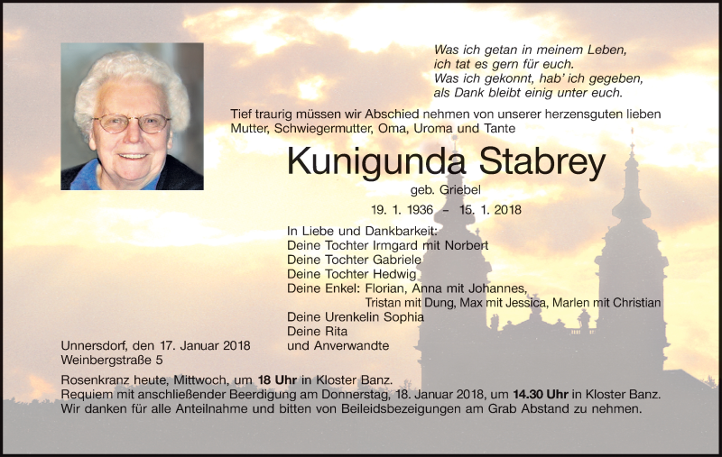 Hier finden Sie alle Traueranzeigen aus der Zeitung, die bisher für Kunigunda Stabrey erschienen sind. Weitere Traueranzeigen, die in der Zeitung erscheinen, werden hier ebenfalls aufgelistet