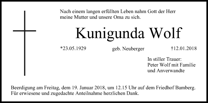 Hier finden Sie alle Traueranzeigen aus der Zeitung, die bisher für Kunigunda Wolf erschienen sind. Weitere Traueranzeigen, die in der Zeitung erscheinen, werden hier ebenfalls aufgelistet