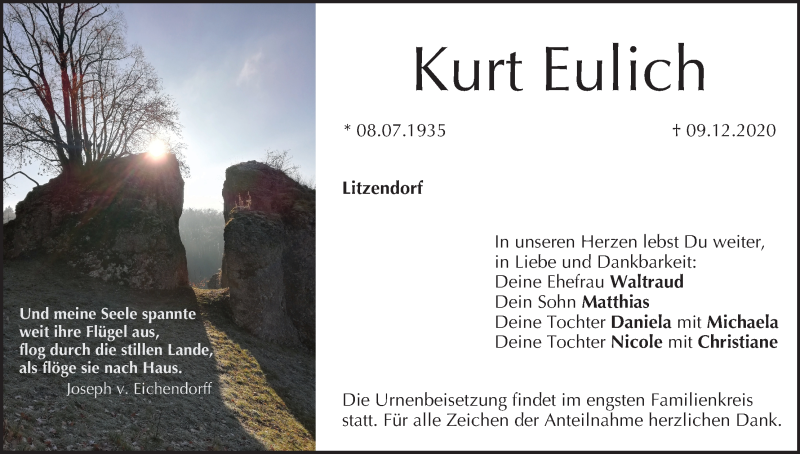 Hier finden Sie alle Traueranzeigen aus der Zeitung, die bisher für Kurt Eulich erschienen sind. Weitere Traueranzeigen, die in der Zeitung erscheinen, werden hier ebenfalls aufgelistet