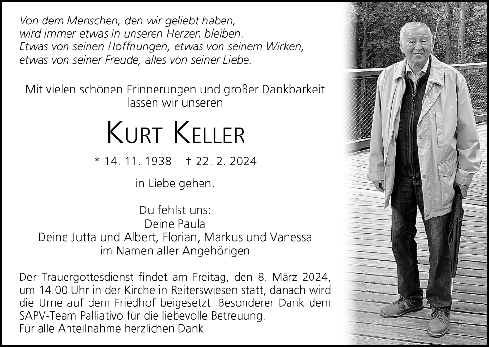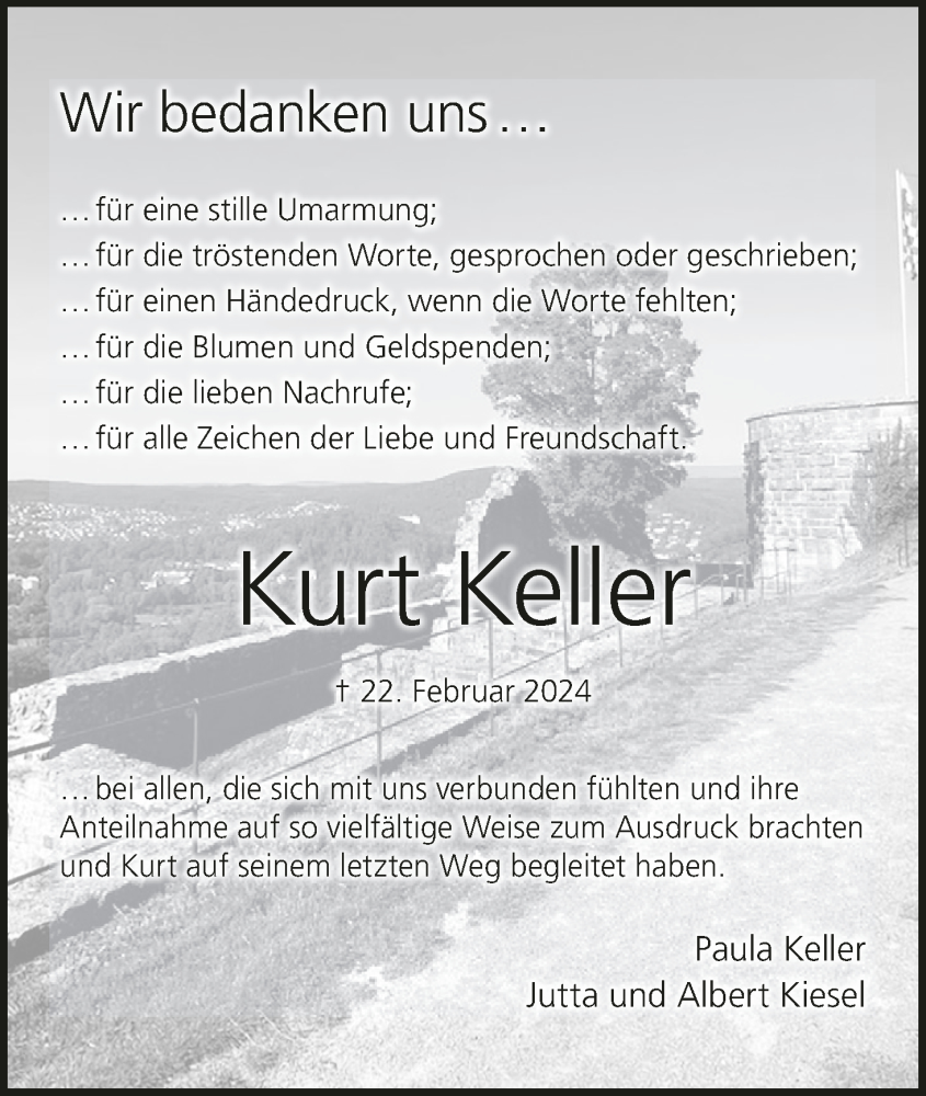 Hier finden Sie alle Traueranzeigen aus der Zeitung, die bisher für Kurt Keller erschienen sind. Weitere Traueranzeigen, die in der Zeitung erscheinen, werden hier ebenfalls aufgelistet
