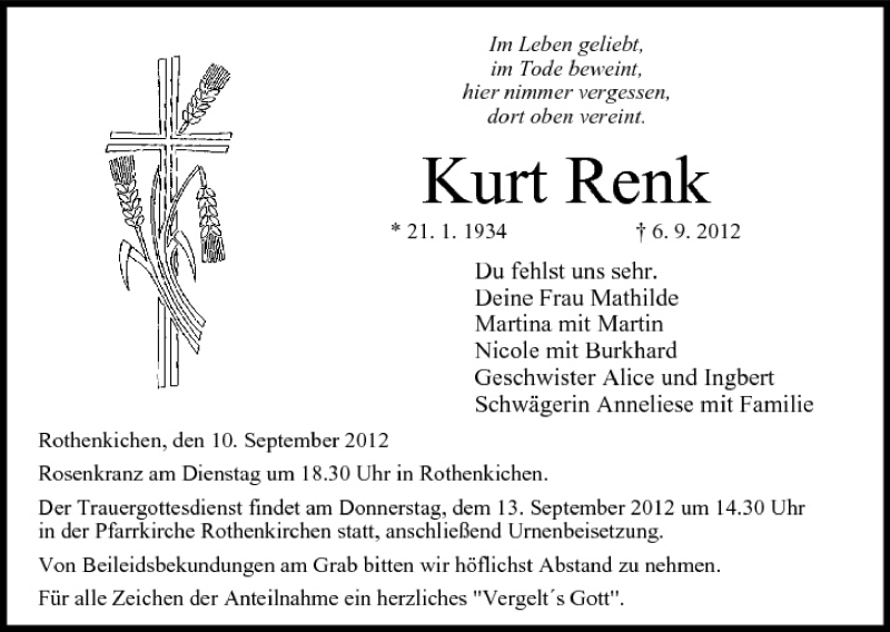 Hier finden Sie alle Traueranzeigen aus der Zeitung, die bisher für Kurt Renk erschienen sind. Weitere Traueranzeigen, die in der Zeitung erscheinen, werden hier ebenfalls aufgelistet
