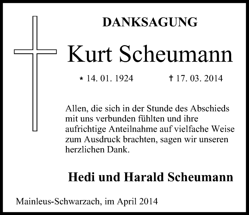 Hier finden Sie alle Traueranzeigen aus der Zeitung, die bisher für Kurt Scheumann erschienen sind. Weitere Traueranzeigen, die in der Zeitung erscheinen, werden hier ebenfalls aufgelistet