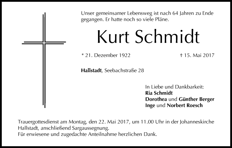 Hier finden Sie alle Traueranzeigen aus der Zeitung, die bisher für Kurt Schmidt erschienen sind. Weitere Traueranzeigen, die in der Zeitung erscheinen, werden hier ebenfalls aufgelistet