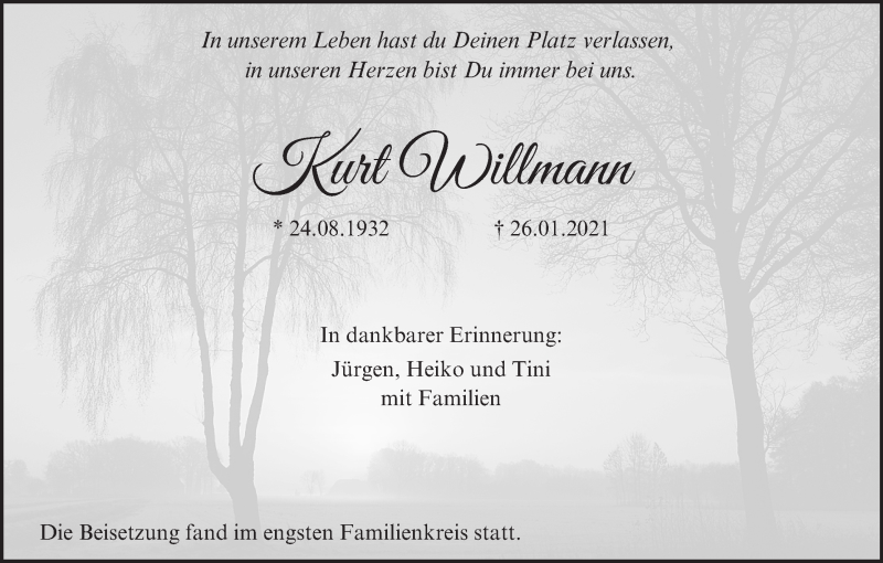 Hier finden Sie alle Traueranzeigen aus der Zeitung, die bisher für Kurt Willmann erschienen sind. Weitere Traueranzeigen, die in der Zeitung erscheinen, werden hier ebenfalls aufgelistet