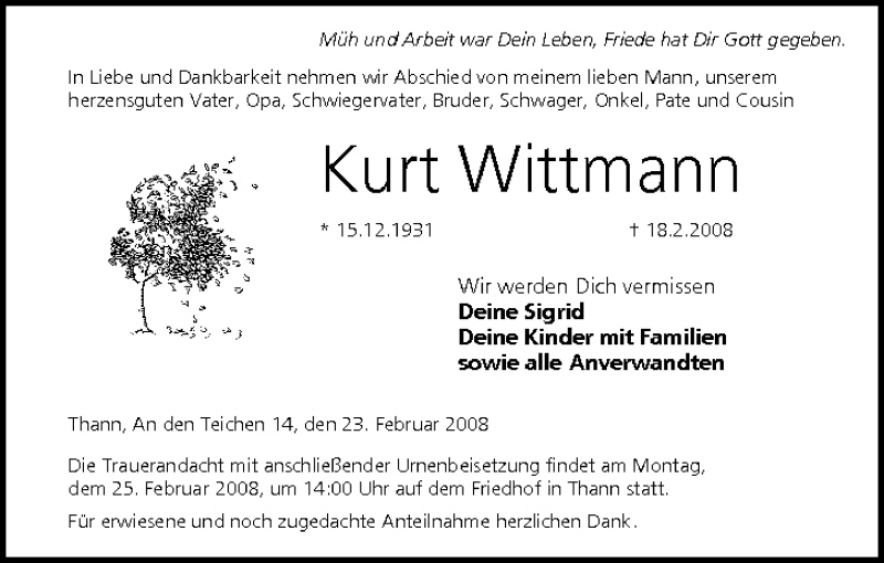 Hier finden Sie alle Traueranzeigen aus der Zeitung, die bisher für Kurt Wittmann erschienen sind. Weitere Traueranzeigen, die in der Zeitung erscheinen, werden hier ebenfalls aufgelistet