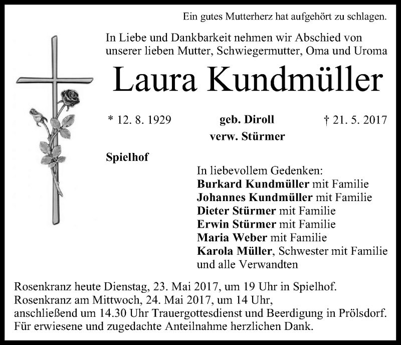 Hier finden Sie alle Traueranzeigen aus der Zeitung, die bisher für Laura Kundmüller erschienen sind. Weitere Traueranzeigen, die in der Zeitung erscheinen, werden hier ebenfalls aufgelistet