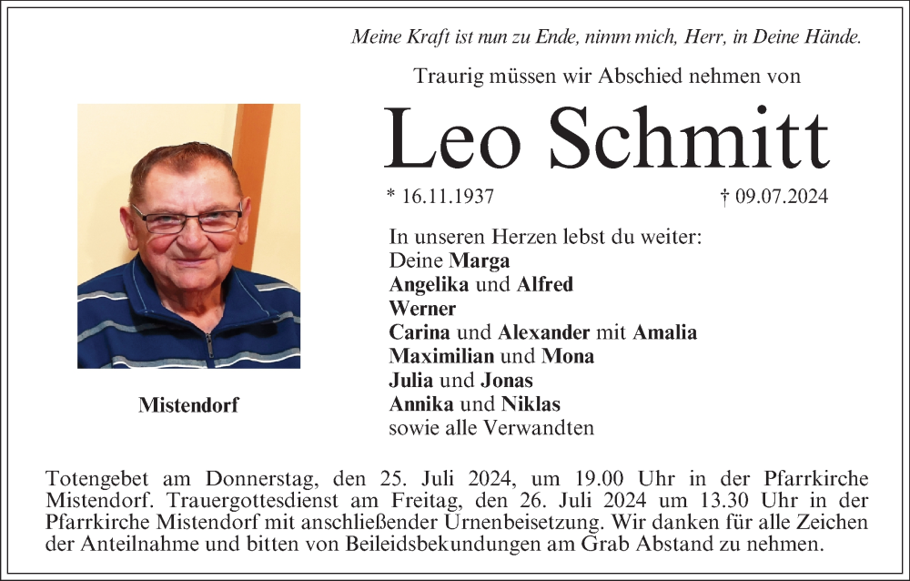 Hier finden Sie alle Traueranzeigen aus der Zeitung, die bisher für Leo Schmitt erschienen sind. Weitere Traueranzeigen, die in der Zeitung erscheinen, werden hier ebenfalls aufgelistet