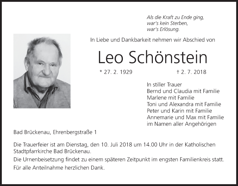 Hier finden Sie alle Traueranzeigen aus der Zeitung, die bisher für Leo Schönstein erschienen sind. Weitere Traueranzeigen, die in der Zeitung erscheinen, werden hier ebenfalls aufgelistet