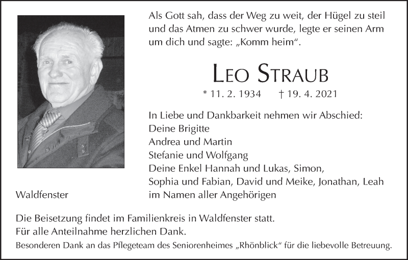 Hier finden Sie alle Traueranzeigen aus der Zeitung, die bisher für Leo Straub erschienen sind. Weitere Traueranzeigen, die in der Zeitung erscheinen, werden hier ebenfalls aufgelistet