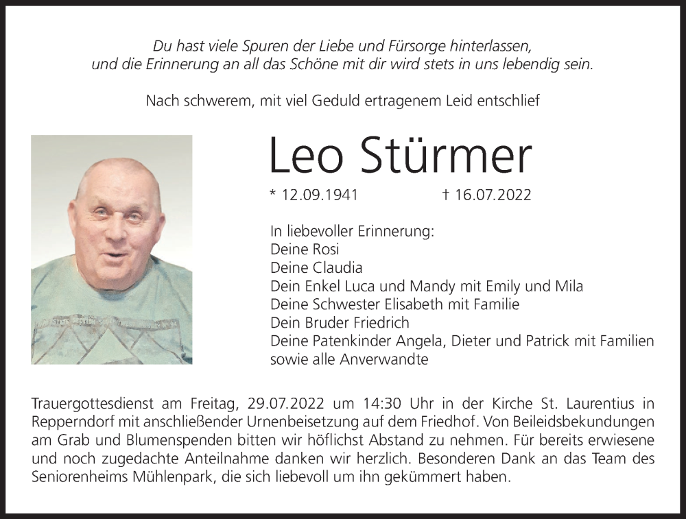 Hier finden Sie alle Traueranzeigen aus der Zeitung, die bisher für Leo Stürmer erschienen sind. Weitere Traueranzeigen, die in der Zeitung erscheinen, werden hier ebenfalls aufgelistet