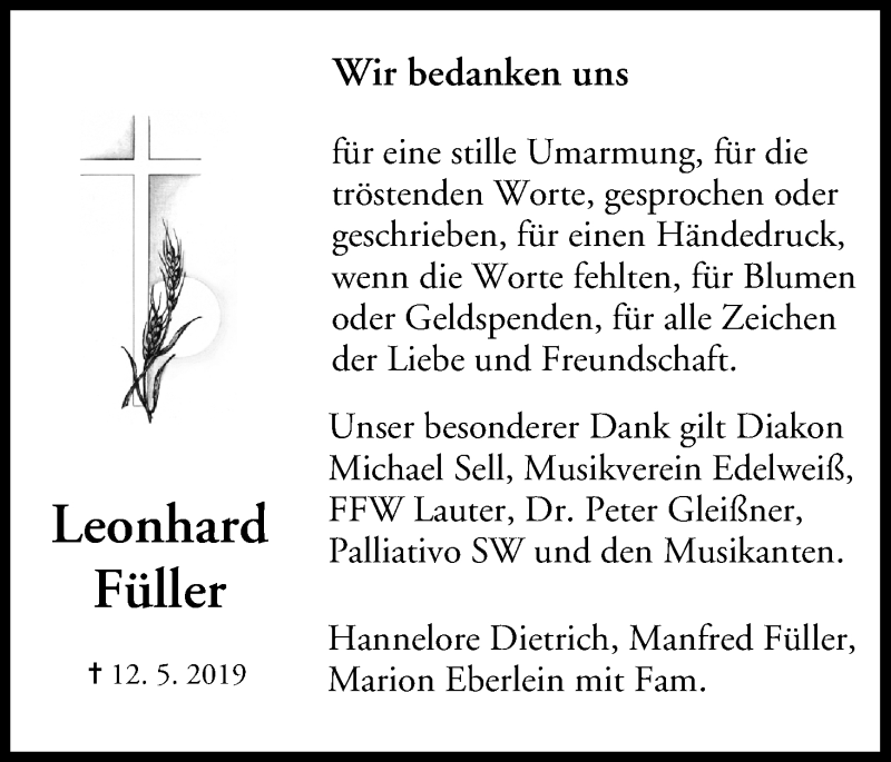 Hier finden Sie alle Traueranzeigen aus der Zeitung, die bisher für Leonhard Füller erschienen sind. Weitere Traueranzeigen, die in der Zeitung erscheinen, werden hier ebenfalls aufgelistet