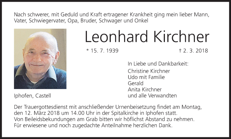 Hier finden Sie alle Traueranzeigen aus der Zeitung, die bisher für Leonhard Kirchner erschienen sind. Weitere Traueranzeigen, die in der Zeitung erscheinen, werden hier ebenfalls aufgelistet