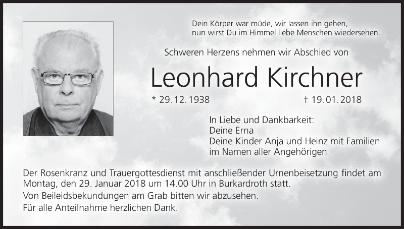 Hier finden Sie alle Traueranzeigen aus der Zeitung, die bisher für Leonhard Kirchner erschienen sind. Weitere Traueranzeigen, die in der Zeitung erscheinen, werden hier ebenfalls aufgelistet