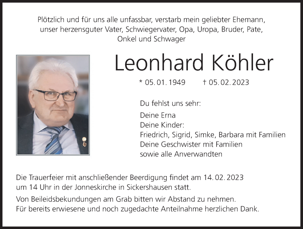 Hier finden Sie alle Traueranzeigen aus der Zeitung, die bisher für Leonhard Köhler erschienen sind. Weitere Traueranzeigen, die in der Zeitung erscheinen, werden hier ebenfalls aufgelistet