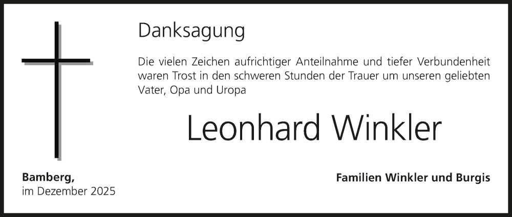 Hier finden Sie alle Traueranzeigen aus der Zeitung, die bisher für Leonhard Winkler erschienen sind. Weitere Traueranzeigen, die in der Zeitung erscheinen, werden hier ebenfalls aufgelistet