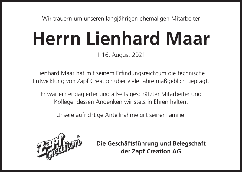 Hier finden Sie alle Traueranzeigen aus der Zeitung, die bisher für Lienhard Maar erschienen sind. Weitere Traueranzeigen, die in der Zeitung erscheinen, werden hier ebenfalls aufgelistet