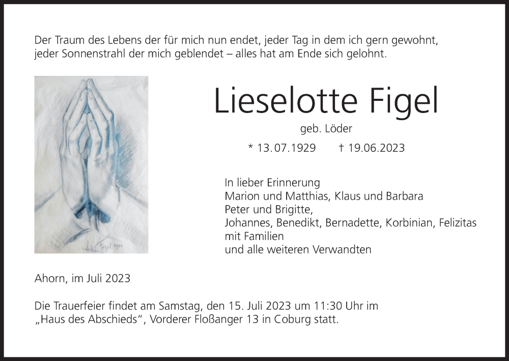 Hier finden Sie alle Traueranzeigen aus der Zeitung, die bisher für Lieselotte Figel erschienen sind. Weitere Traueranzeigen, die in der Zeitung erscheinen, werden hier ebenfalls aufgelistet