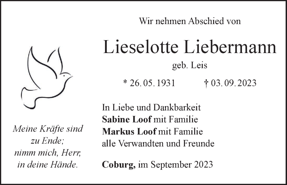 Hier finden Sie alle Traueranzeigen aus der Zeitung, die bisher für Lieselotte Liebermann erschienen sind. Weitere Traueranzeigen, die in der Zeitung erscheinen, werden hier ebenfalls aufgelistet