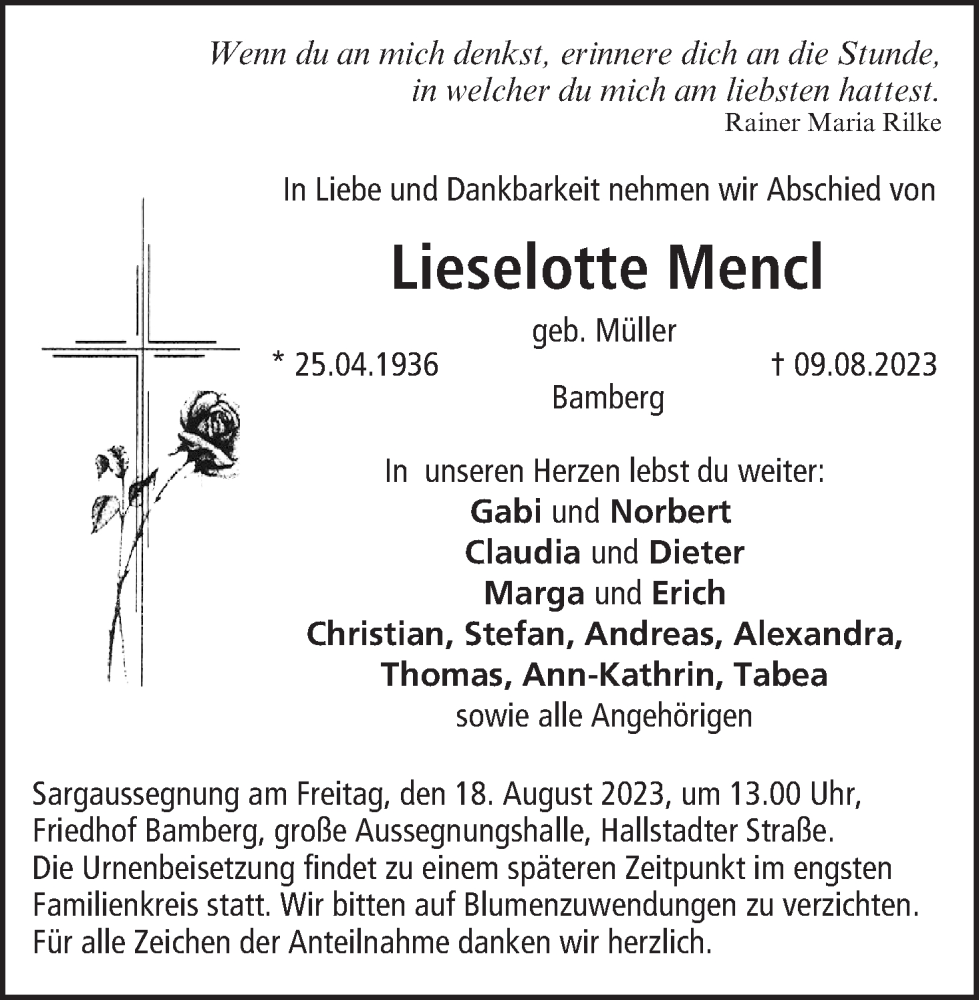 Hier finden Sie alle Traueranzeigen aus der Zeitung, die bisher für Lieselotte Mencl erschienen sind. Weitere Traueranzeigen, die in der Zeitung erscheinen, werden hier ebenfalls aufgelistet