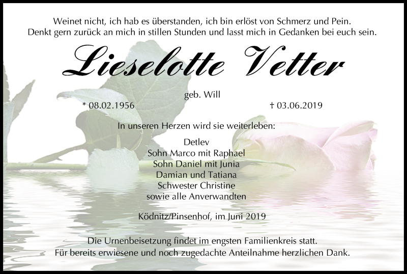 Hier finden Sie alle Traueranzeigen aus der Zeitung, die bisher für Lieselotte Vetter erschienen sind. Weitere Traueranzeigen, die in der Zeitung erscheinen, werden hier ebenfalls aufgelistet