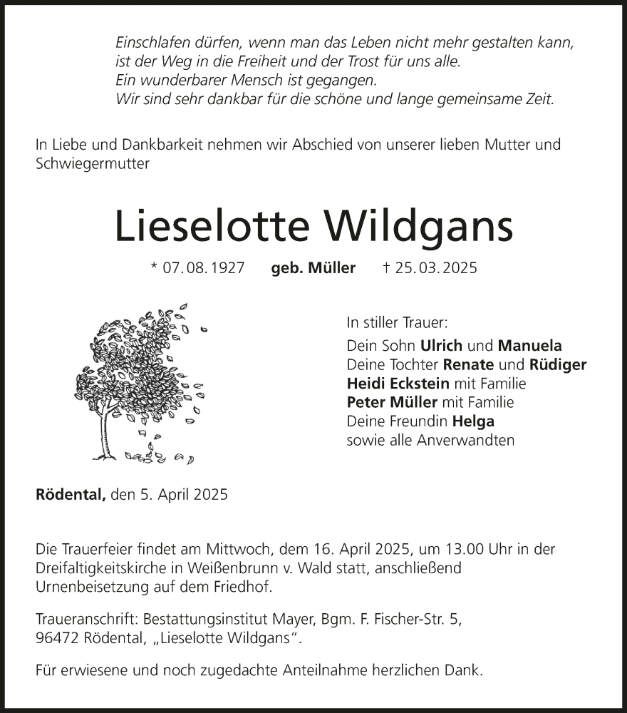Hier finden Sie alle Traueranzeigen aus der Zeitung, die bisher für Lieselotte Wildgans erschienen sind. Weitere Traueranzeigen, die in der Zeitung erscheinen, werden hier ebenfalls aufgelistet