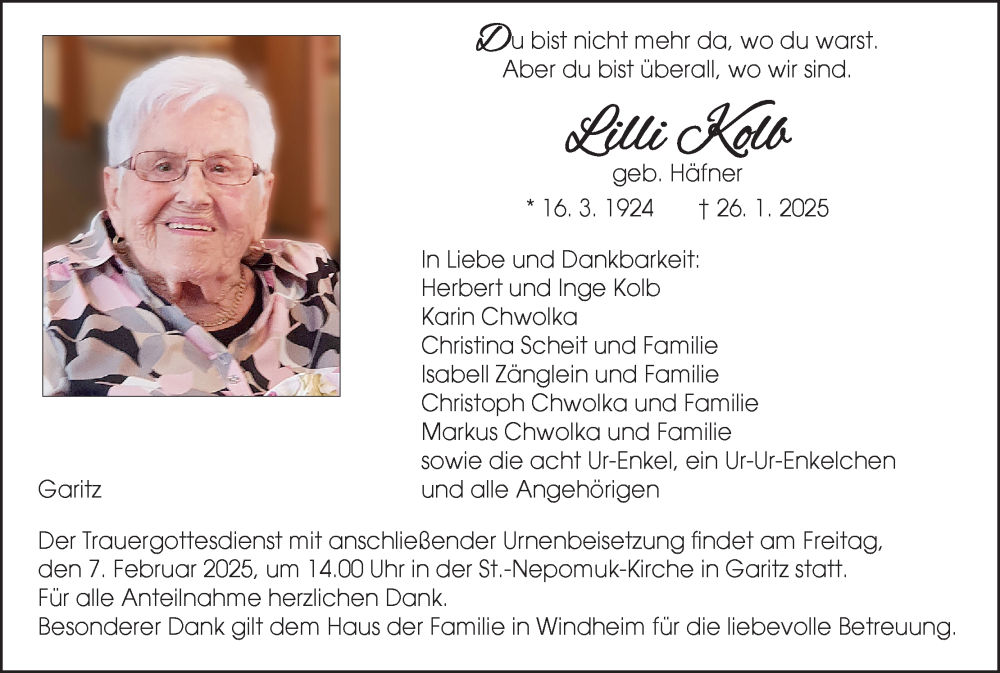 Hier finden Sie alle Traueranzeigen aus der Zeitung, die bisher für Lilli Kolb erschienen sind. Weitere Traueranzeigen, die in der Zeitung erscheinen, werden hier ebenfalls aufgelistet