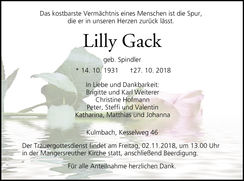 Hier finden Sie alle Traueranzeigen aus der Zeitung, die bisher für Lilly Gack erschienen sind. Weitere Traueranzeigen, die in der Zeitung erscheinen, werden hier ebenfalls aufgelistet