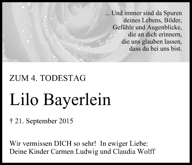 Hier finden Sie alle Traueranzeigen aus der Zeitung, die bisher für Lilo Bayerlein erschienen sind. Weitere Traueranzeigen, die in der Zeitung erscheinen, werden hier ebenfalls aufgelistet