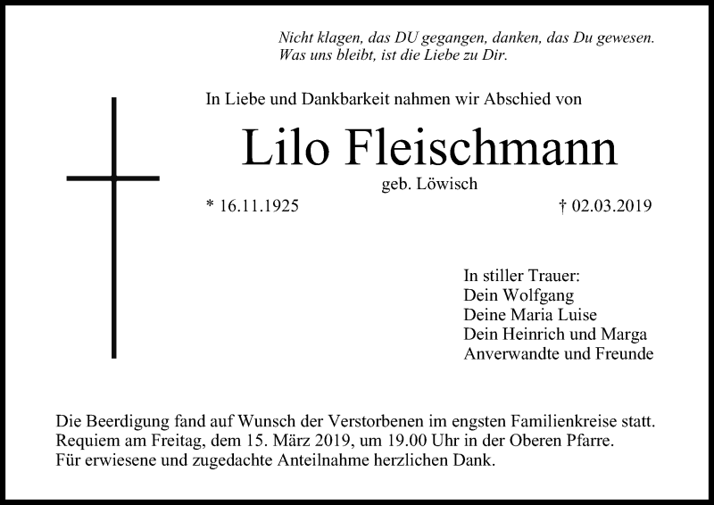 Hier finden Sie alle Traueranzeigen aus der Zeitung, die bisher für Lilo Fleischmann erschienen sind. Weitere Traueranzeigen, die in der Zeitung erscheinen, werden hier ebenfalls aufgelistet