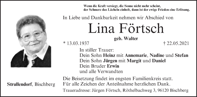 Hier finden Sie alle Traueranzeigen aus der Zeitung, die bisher für Lina Förtsch erschienen sind. Weitere Traueranzeigen, die in der Zeitung erscheinen, werden hier ebenfalls aufgelistet