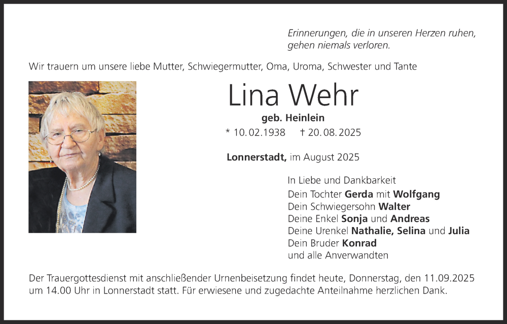 Hier finden Sie alle Traueranzeigen aus der Zeitung, die bisher für Lina Wehr erschienen sind. Weitere Traueranzeigen, die in der Zeitung erscheinen, werden hier ebenfalls aufgelistet