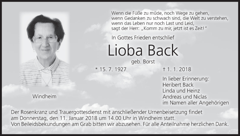 Hier finden Sie alle Traueranzeigen aus der Zeitung, die bisher für Lioba Back erschienen sind. Weitere Traueranzeigen, die in der Zeitung erscheinen, werden hier ebenfalls aufgelistet